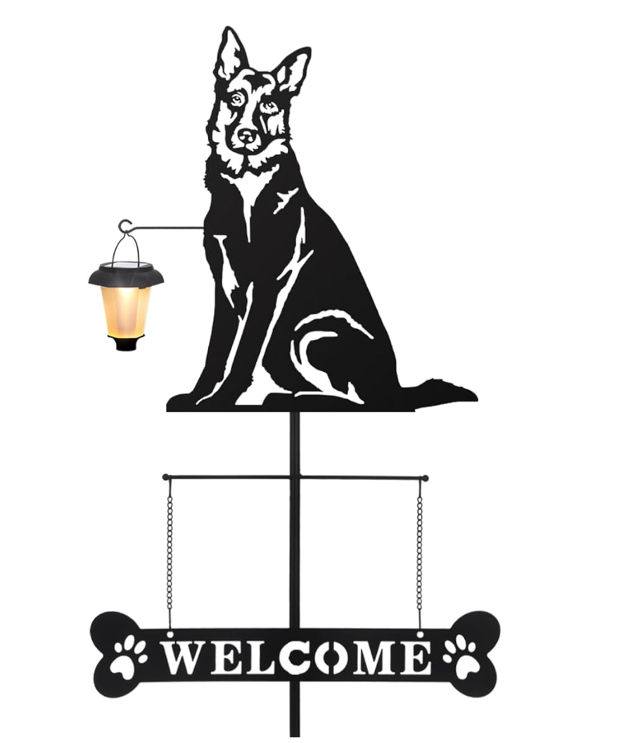 Welcome guests with charm using this German Shepherd Silhouette Welcome Sign—a 39.5” metal garden stake featuring a friendly German Shepherd holding a lantern.
